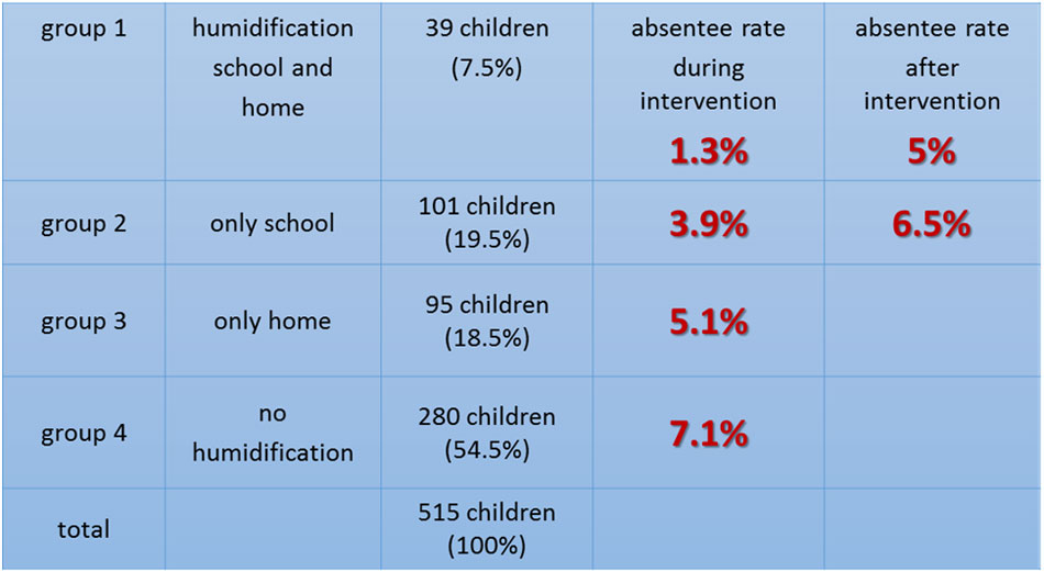 Results: reduction of absentee days by almost 50% through humidification at school. A further decrease of absenteeism was achieved by additional humidification at home, while the absentee rates returned to pre-study rates after ending the humidification efforts.